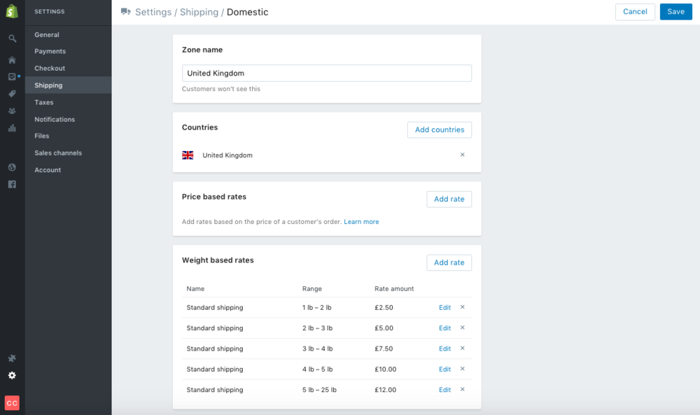 The amount you decide to charge will depend on the products you are selling. For example, an apparel store based in the UK might have its shipping rates set up like this: